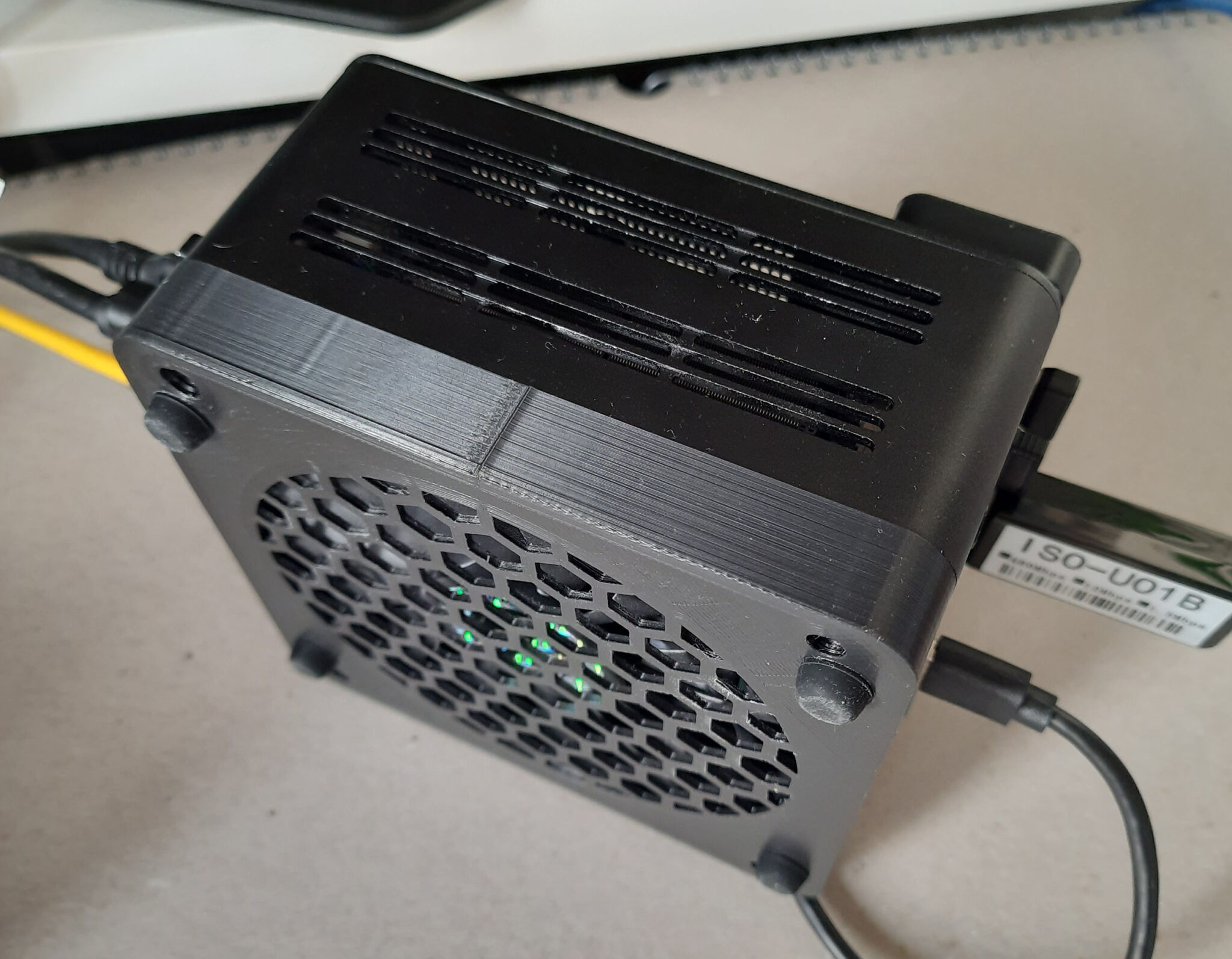 Das fertige Gehäuse mit eingebautem Lüfter, der mit doppelseitigem Schaumklebeband in zwei Lagen (je etwa 1 mm dick) befestigt ist, sodass ein kleiner Abstand zwischen den Lüfterblättern und dem Gitter bleibt.
