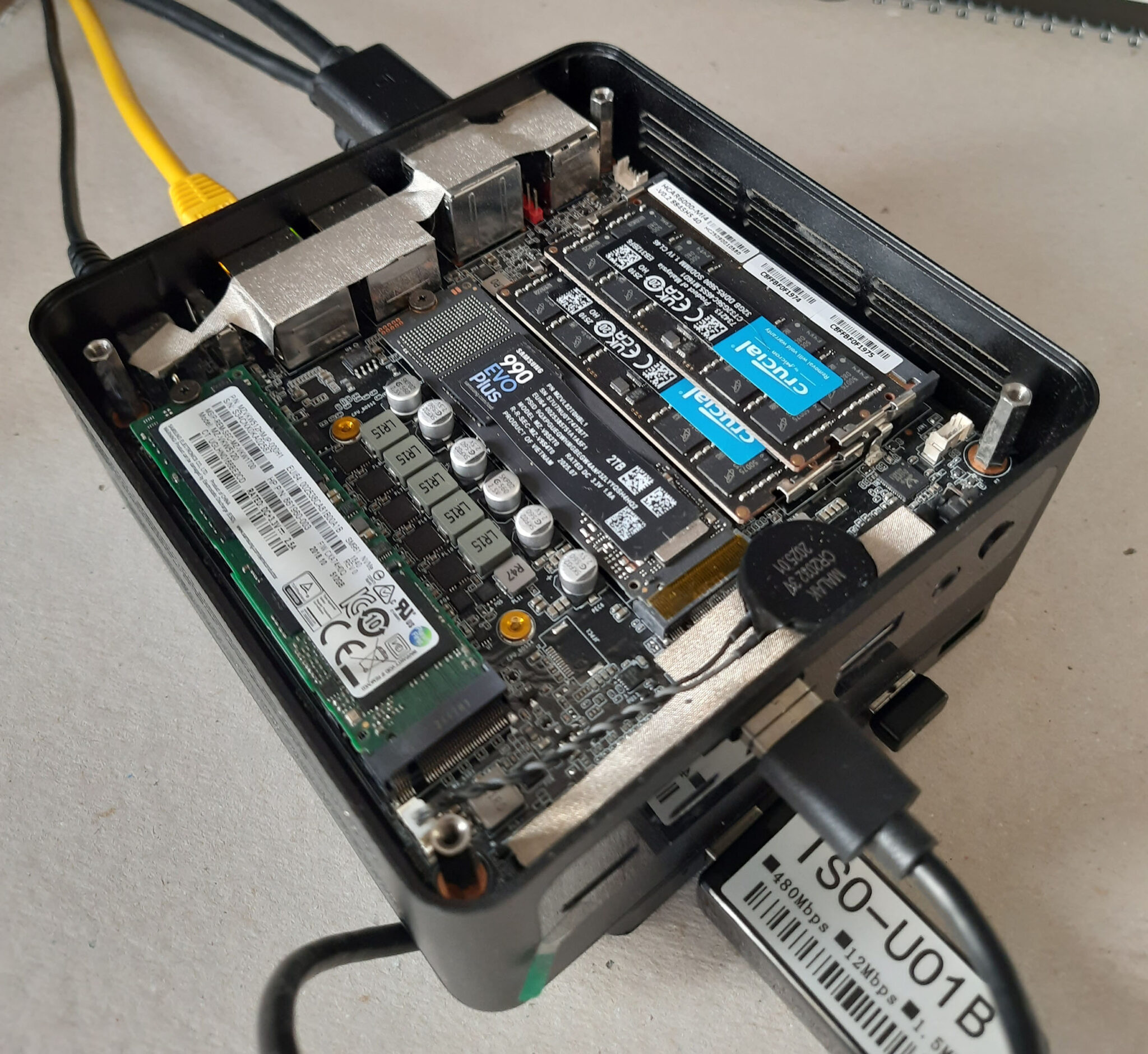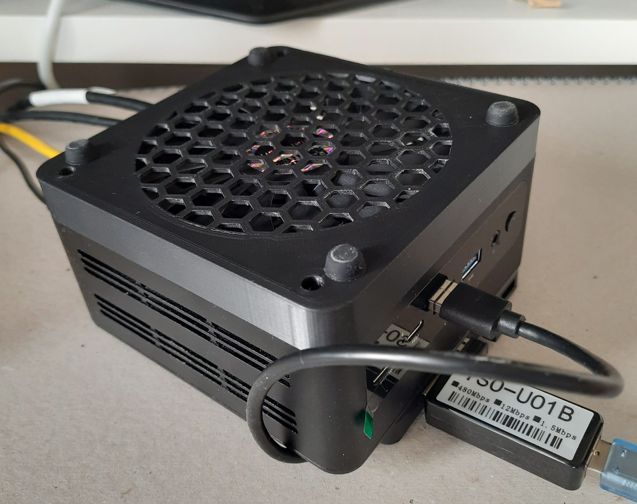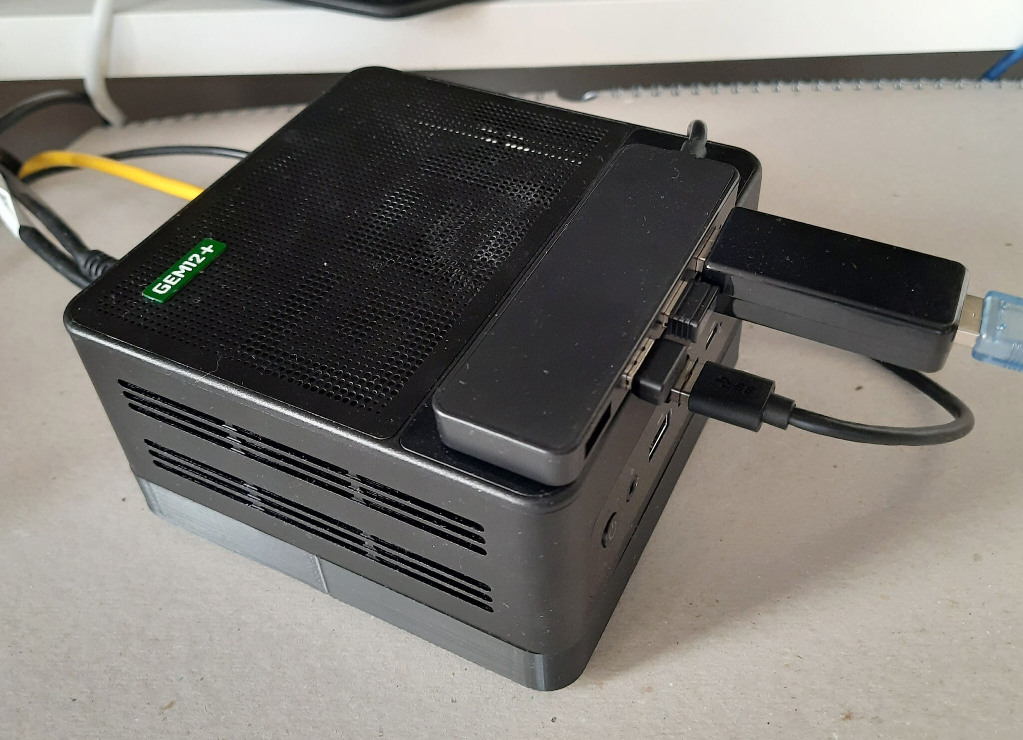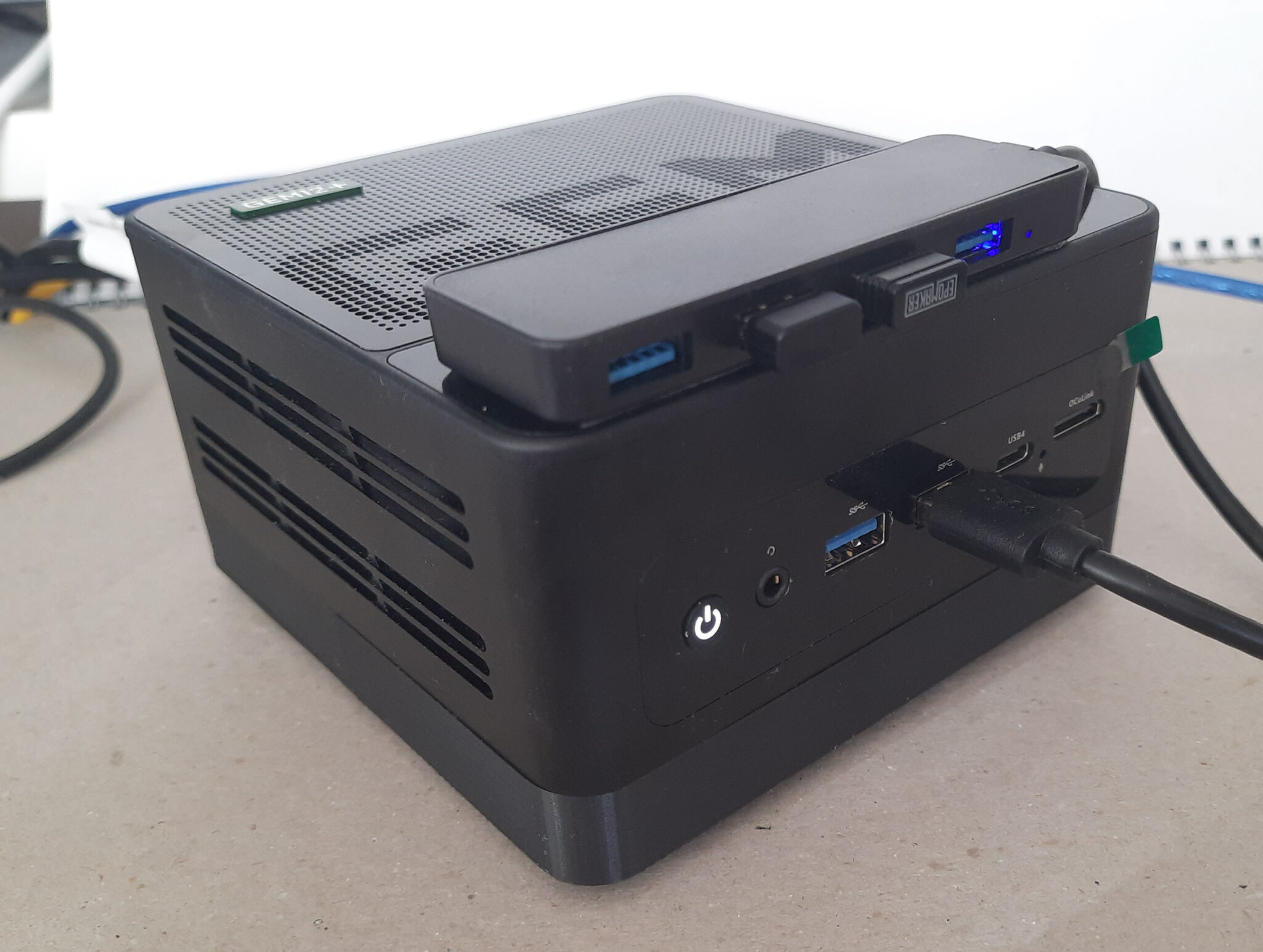 Gesamtansicht des Mini-PCs. Oben habe ich mit doppelseitigem Klebeband einen USB-Hub befestigt.