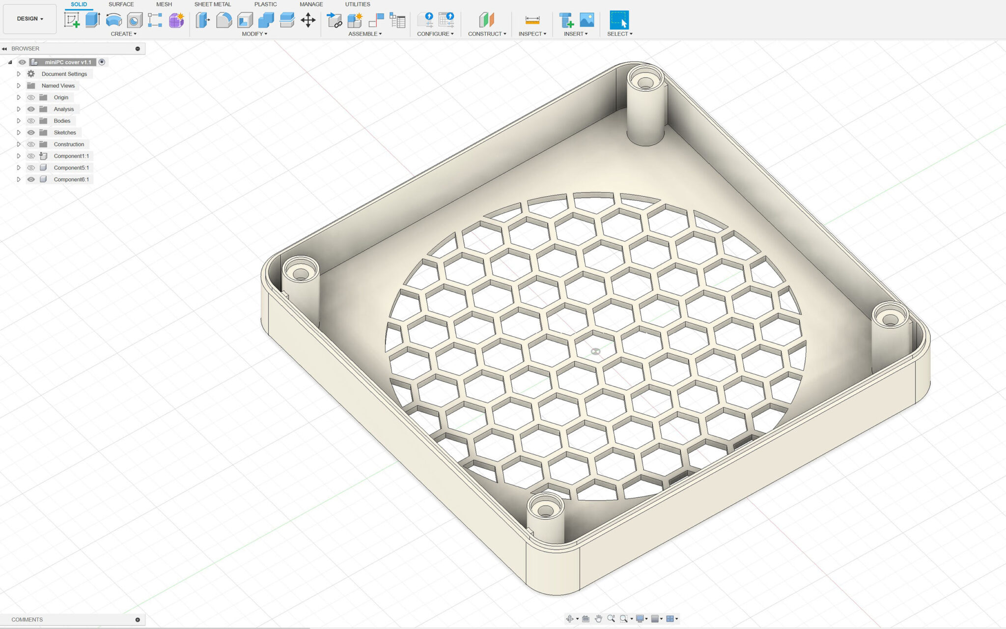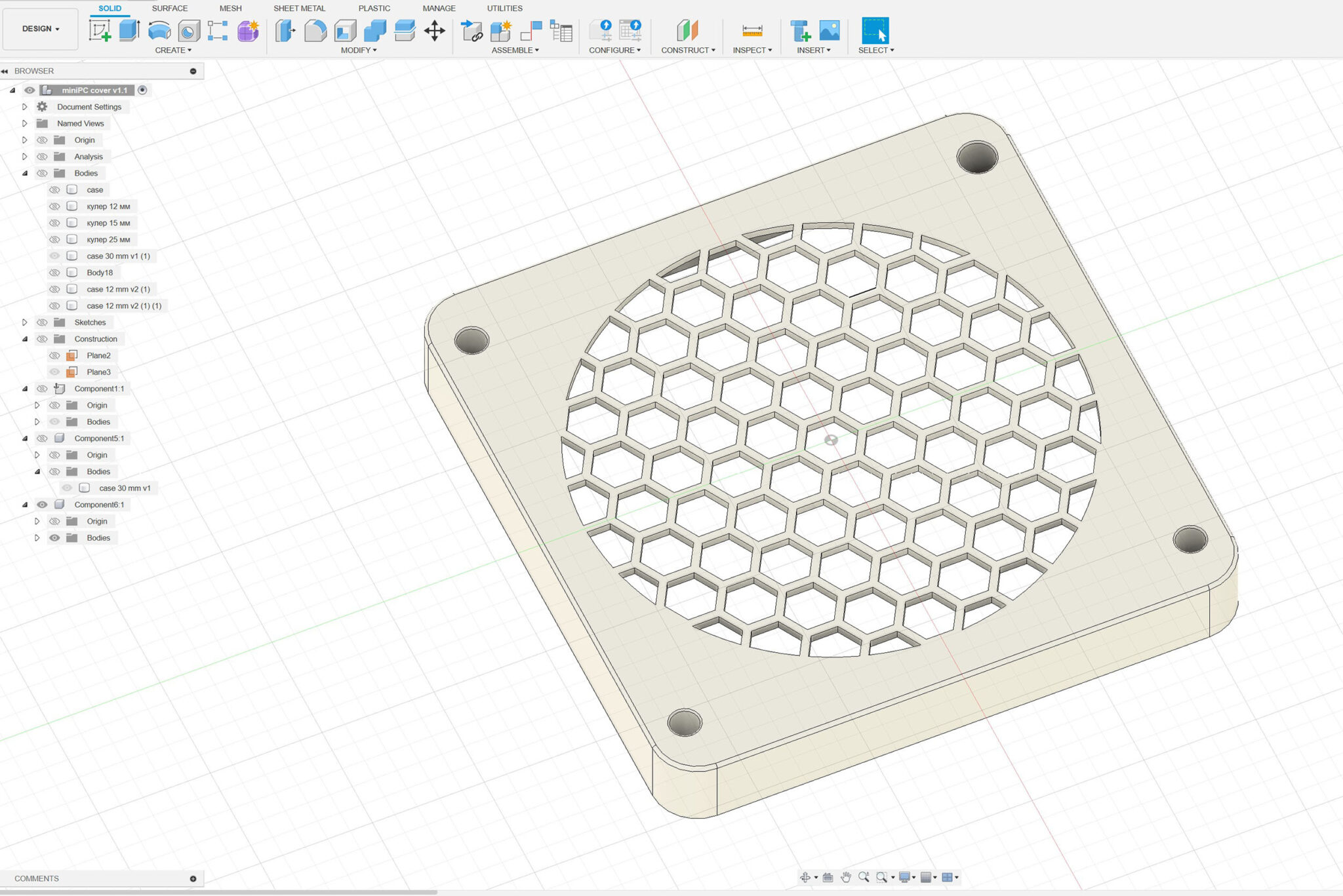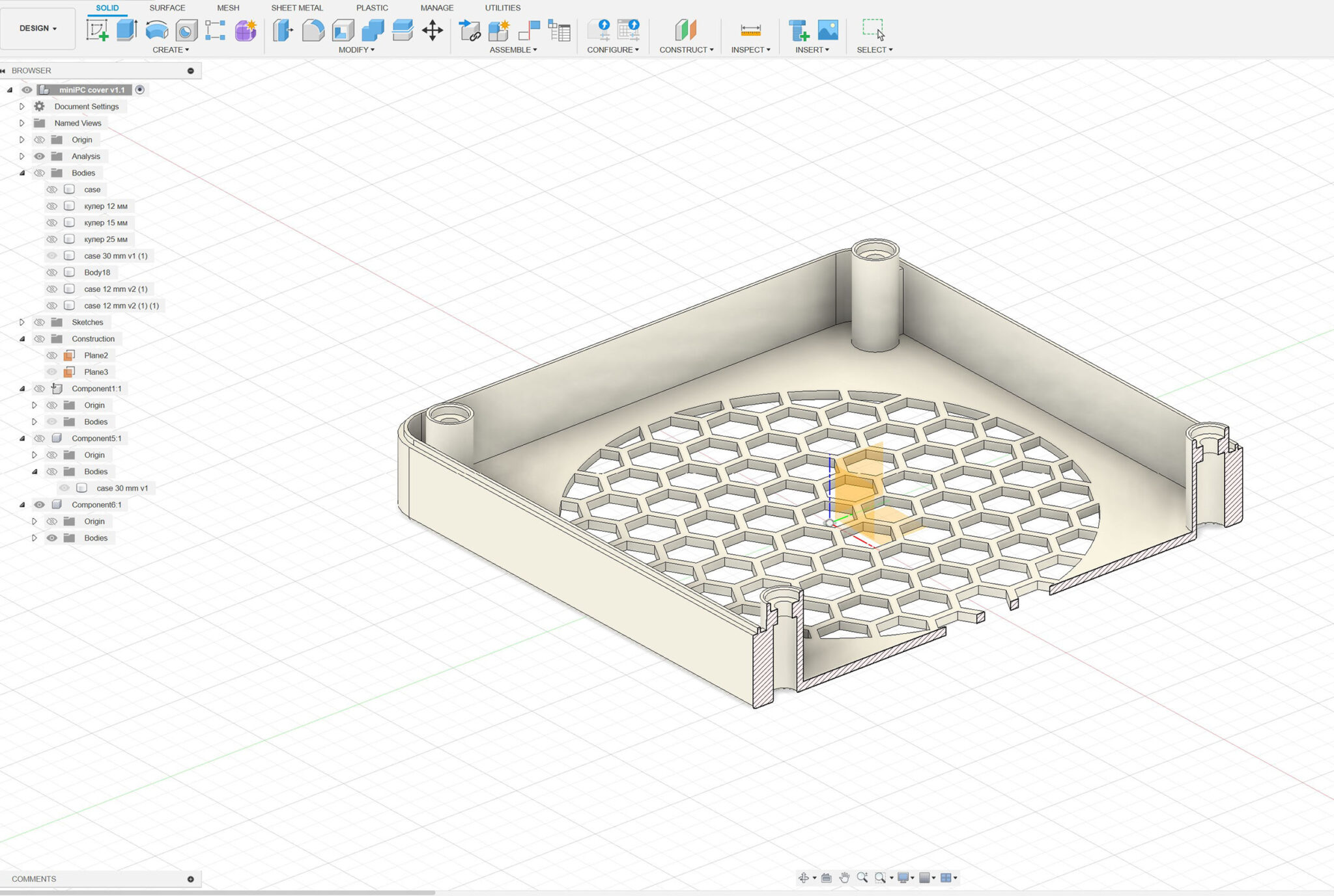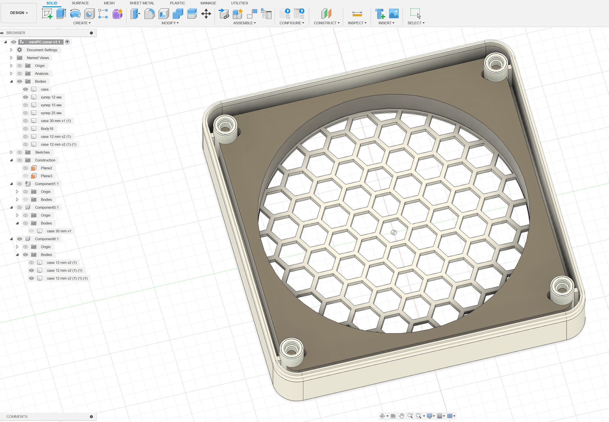 Unter Berücksichtigung der gemachten Fehler habe ich ein neues Gehäusemodell entworfen – für einen Lüfter mit 12 mm Stärke, den ich auf Aliexpress bestellt habe. Außerdem habe ich YouTube-Tutorials genutzt, um ein Wabengitter-Design zu erstellen.