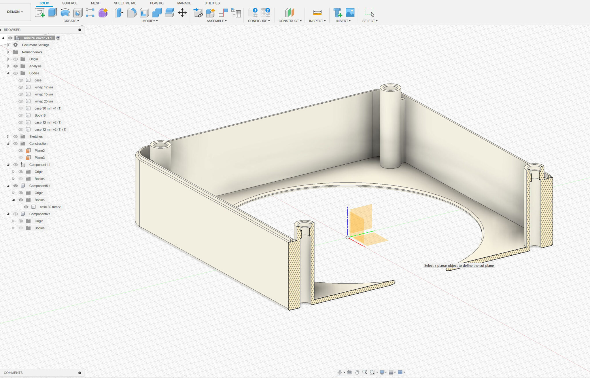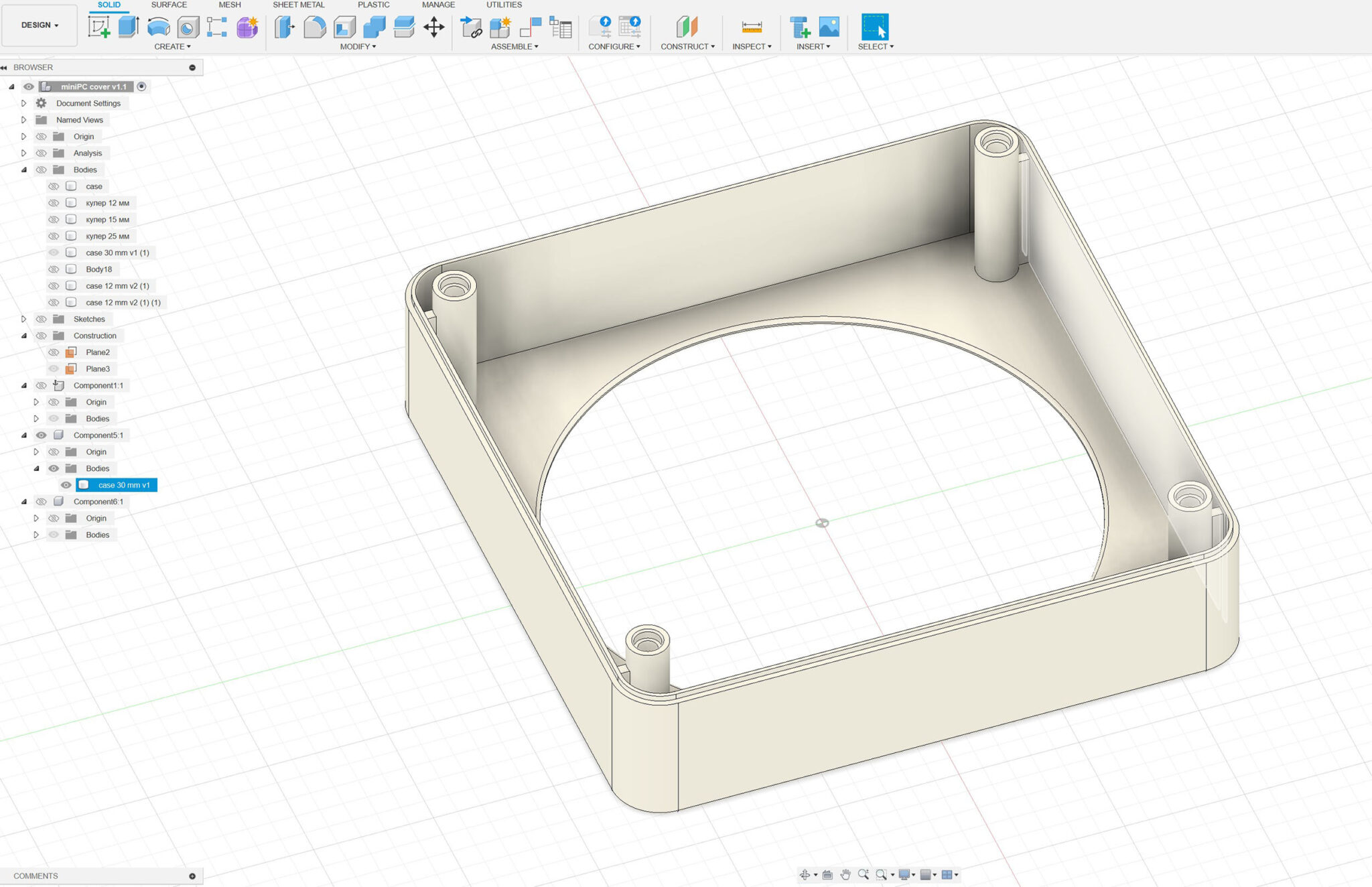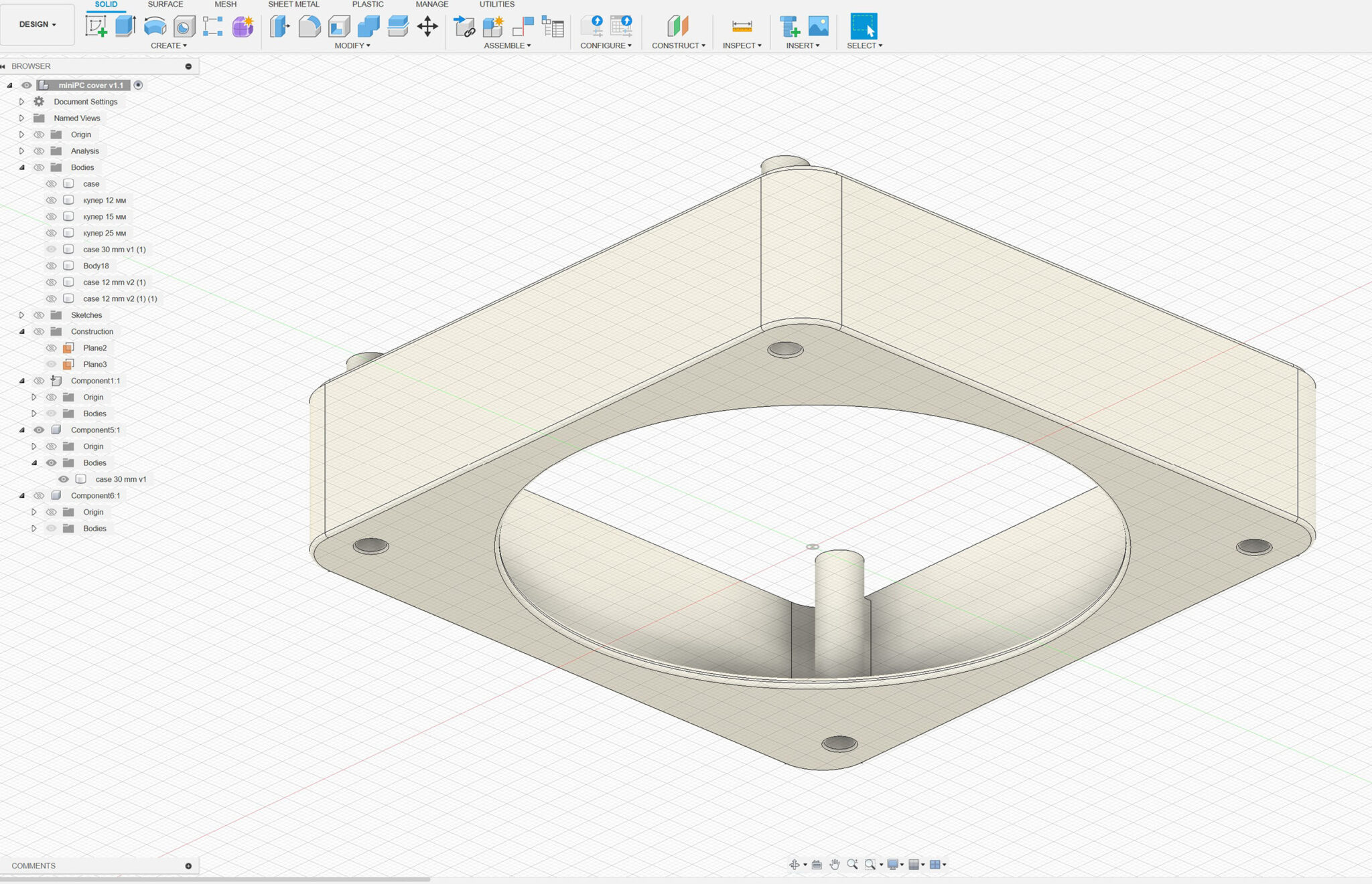 In Fusion 360 habe ich die erste Version der Unterabdeckung entworfen – für einen Lüfter mit einer Stärke von 25 mm. Ich hatte bereits ein Metallgitter zur Verfügung und plante, es in dieses Gehäuse einzubauen, um die Lüfterblätter vor dem zufälligen Eindringen größerer Gegenstände zu schützen.