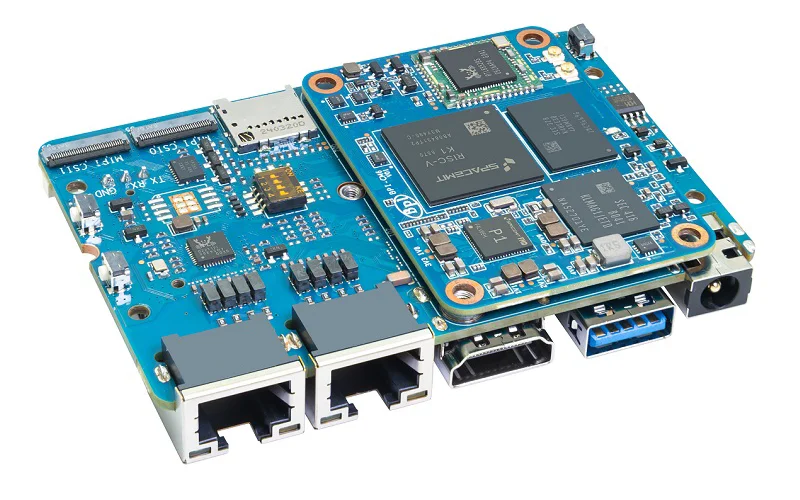 По форме, габаритам и расположению коннекторов новинка идентична Raspberry Pi CM4. Задействован чип SpacemiT K1, который объединяет восемь 64-битных ядер RISC-V, графический блок Imagination BXE-2-32 с поддержкой OpenCL 3.0, OpenGL ES3.2 и Vulkan 1.3, а также нейропроцессорный узел (NPU) с производительностью до 2 TOPS для ускорения ИИ-операций.